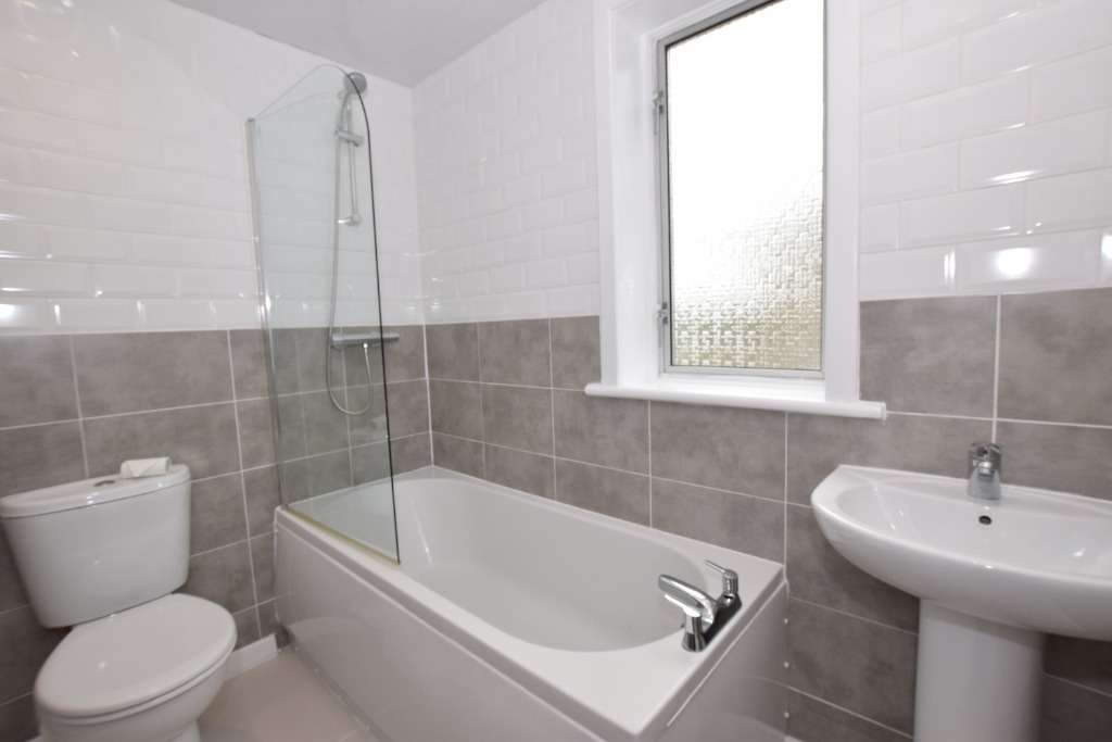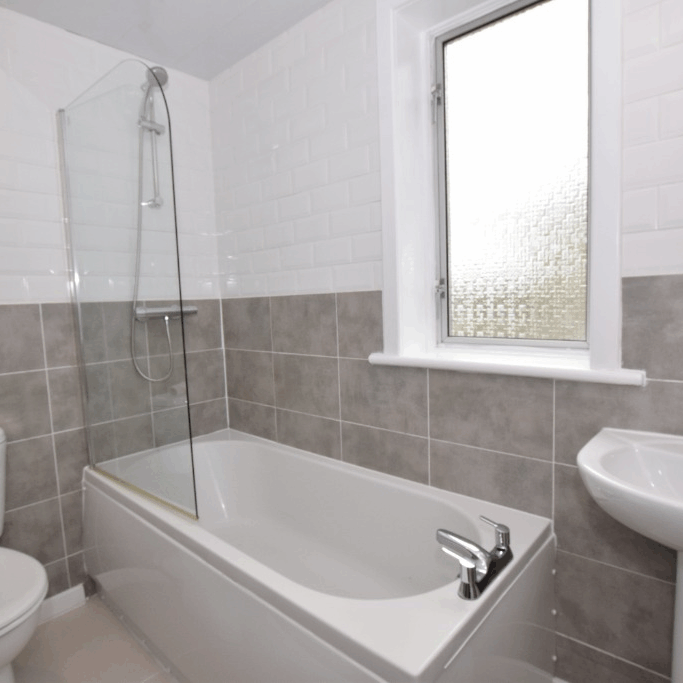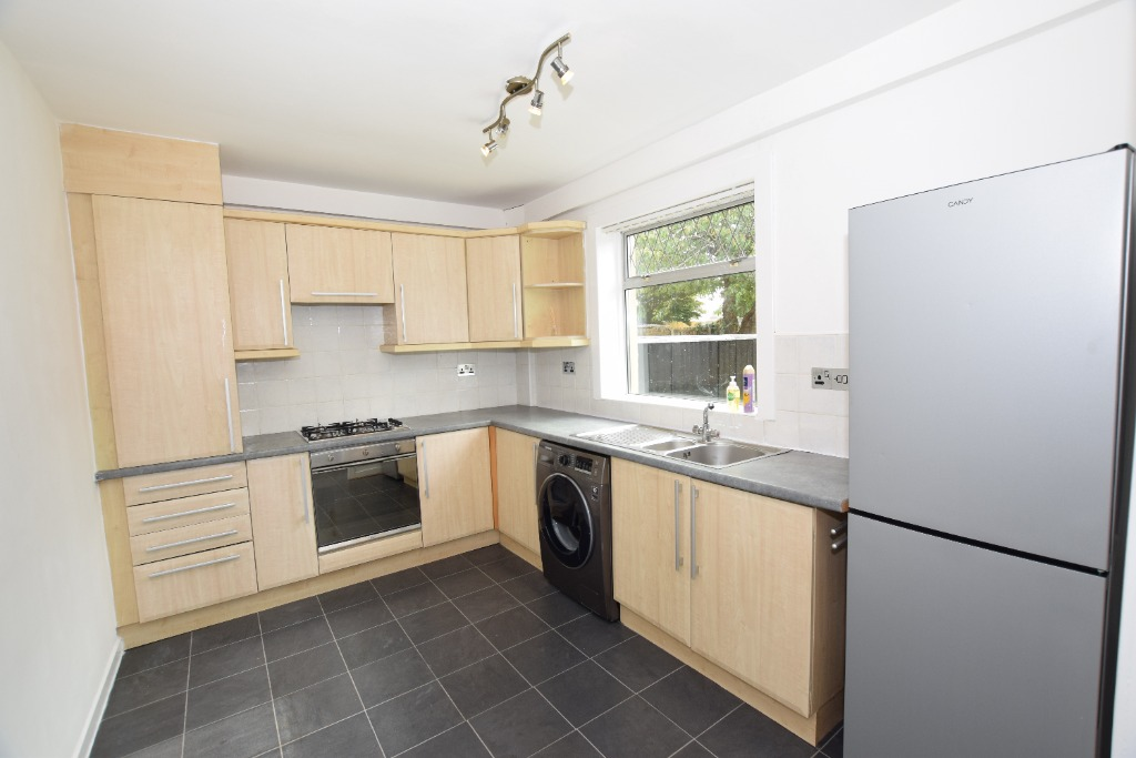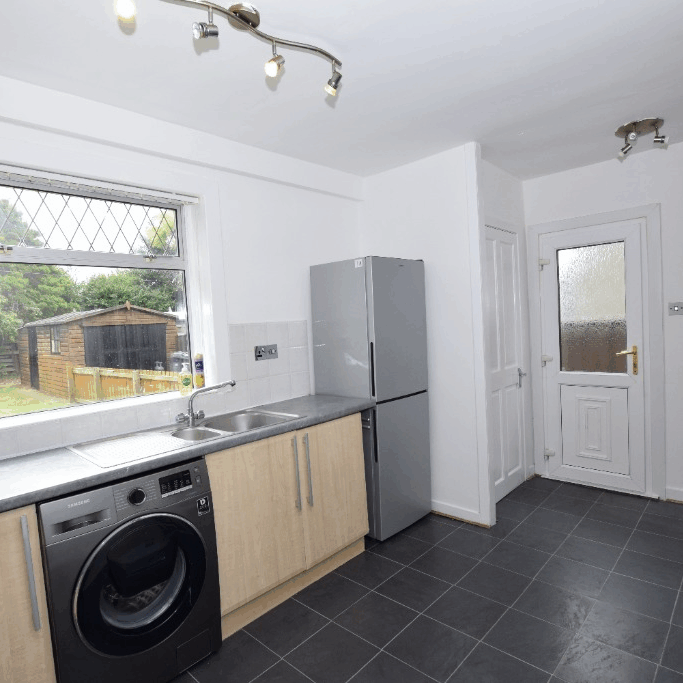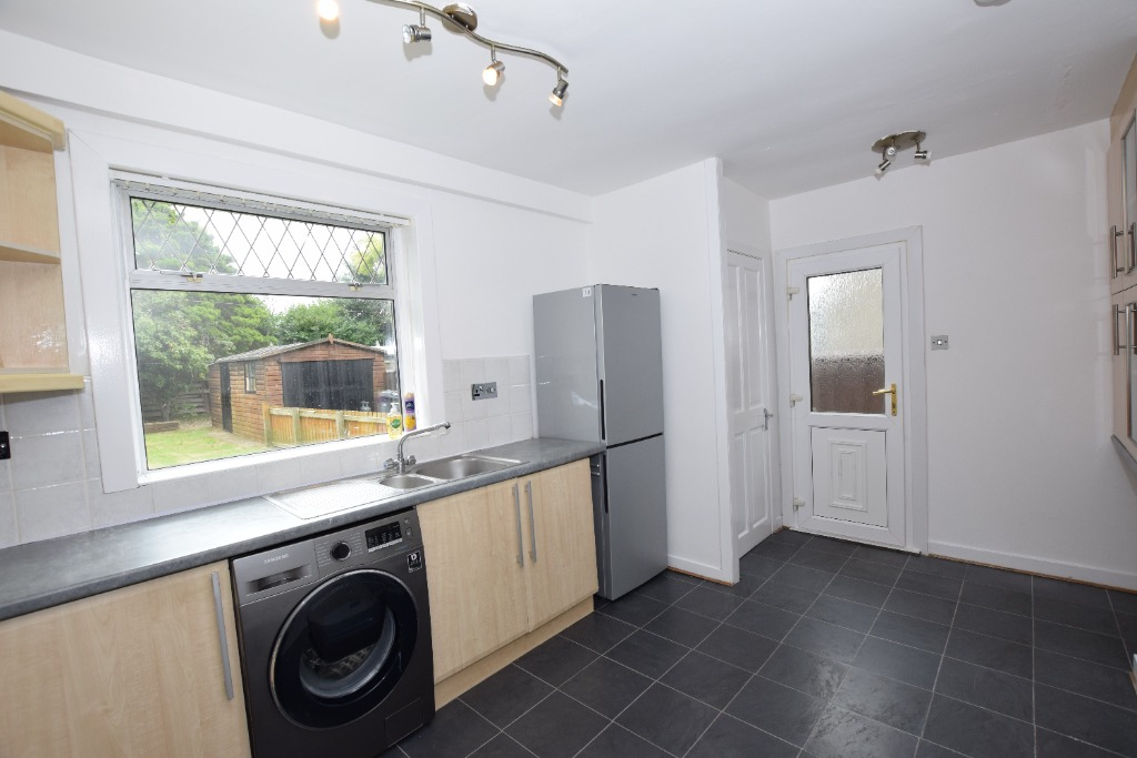 The property comprises entrance hallway, spacious front facing lounge with feature fireplace, rear facing kitchen with space for dining, complemented by integrated oven and hob with freestanding washing machine and fridge freezer and allowing access to the rear garden, 2 double bedrooms, both with built-in storage and a modern family bathroom with thermostatic shower over bath.
