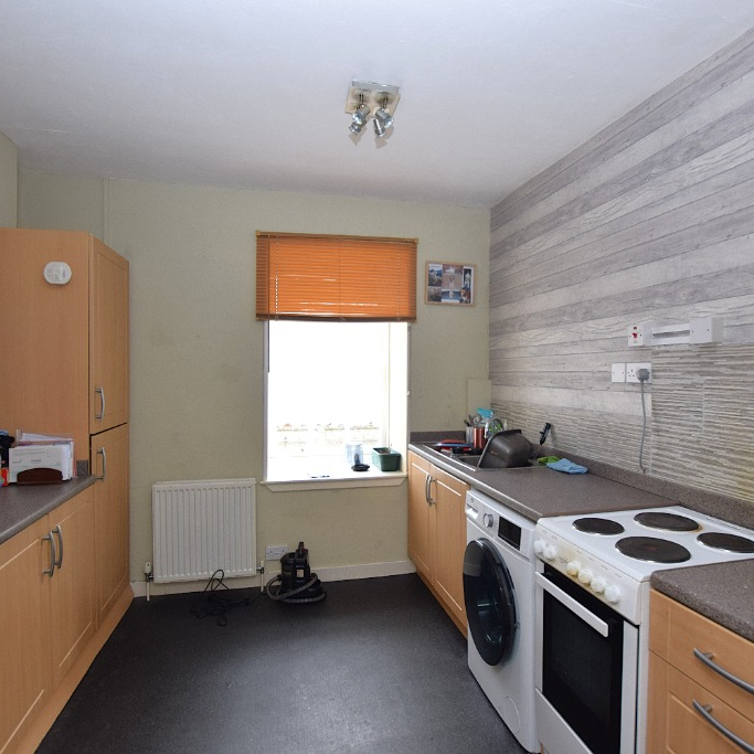 The kitchen is fitted with base and wall mounted units, providing practical workspace and room for freestanding appliances.