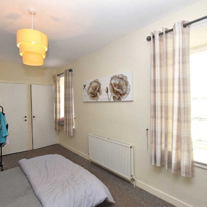 The bedroom is a well-proportioned double with space for freestanding storage. The bathroom includes a bath with overhead shower, WC and wash hand basin.