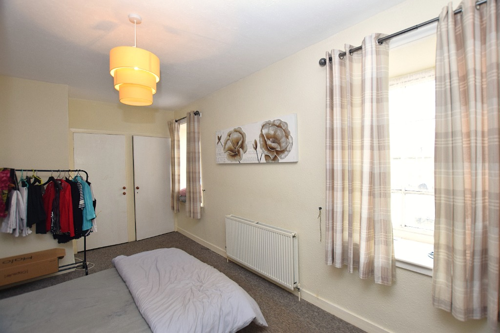 The bedroom is a well-proportioned double with space for freestanding storage. The bathroom includes a bath with overhead shower, WC and wash hand basin.