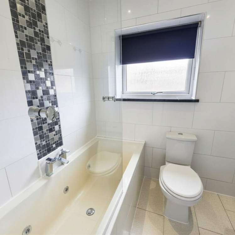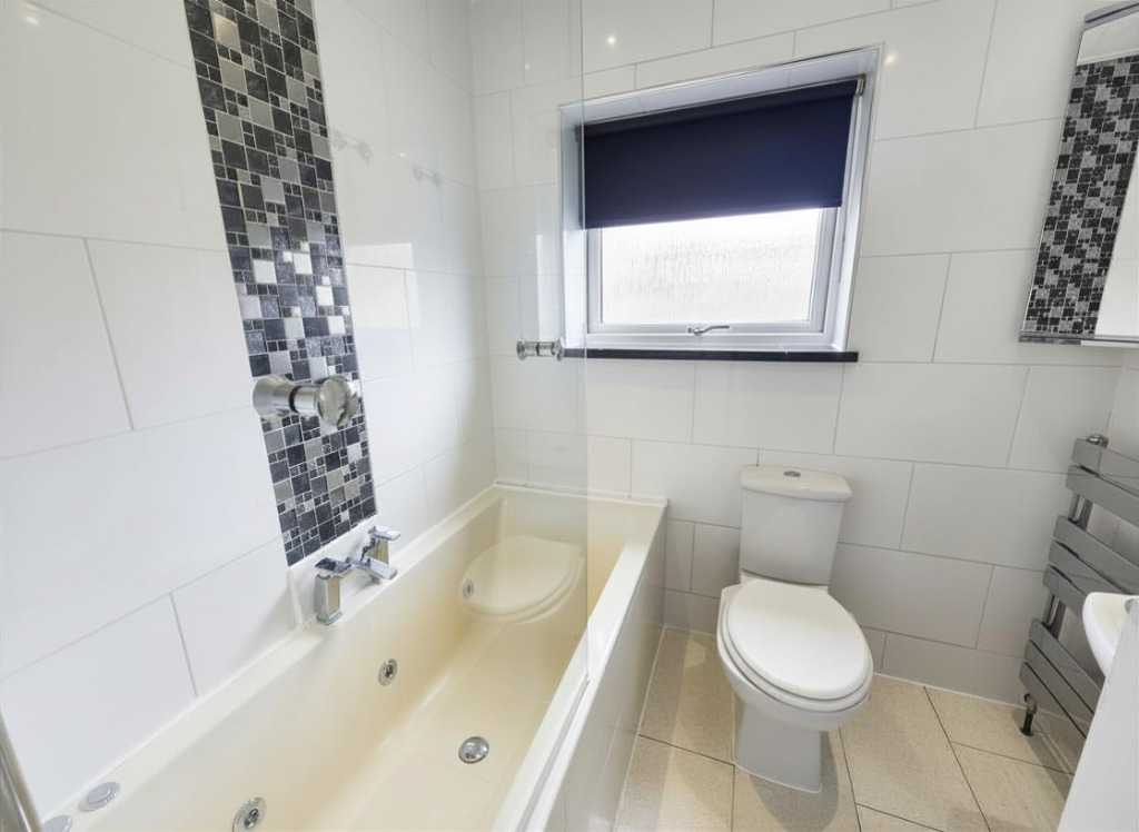A modern bathroom fitted with a white suite and shower over bath, finished with contemporary tiling.